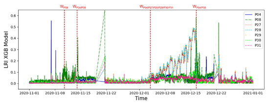 Those events include three emergency stop alarms recorded, respectively, on 13 November 2020 (event ID: S_13_11), 19 November 2020 (event ID: S_19_11) and 21 December 2020 (event ID: S_21_12) as well as a shutdown transient due to an anomaly found on the generator temperature on 16 December 2020 (event ID: DS_16_12). From a global analysis of the LRI trends, shown in Figure 9 and Figure 10, different anomalies were detected during the observed period in the engine cylinders and generator. In particular, previously found anomalies on the cylinder exhaust temperature, correlated with two long outages in October 2020, recurred from 13 November 2020, when a warning on the involved parameter was triggered by both MLP (Figure 9) and XGBoost (Figure 10). This significant deviation of the P08 parameter indicator persisted for about three days until an emergency stop was recorded on 13 November 2020.