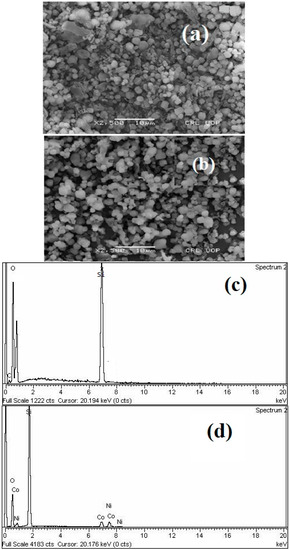 Figure 1a,b show the SEM pictures of the MCM-41 and 9% Ni/8% Co/MCM-41, respectively. The micrographs show spongy features outlining the spherical and the ordered morphology with less agglomeration, which shows that the surface features of the MCM-41 have not been changed following the addition of Ni and Co because they are less than 10%, which was also confirmed by using XRD and with the appearance of an intense peak. These results are in accordance with the findings by Grün et al. [29], who noted that the as-prepared MCM-41 particles were spherical in shape and less agglomerated. Likewise, Nejat et al. [30] assessed the morphologies of MCM-41, Ni/MCM-41, and Co/MCM-41 using a field emission scanning electron microscopy and observed that the particles were spherical in shape and uniform in size with a diameter of 50 nm and that there was no change in their morphology following the incorporation of Co and Ni. Wu et al. [31] observed no change in the surface morphology of Ni-MCM-41 with Ni loadings of 5, 10, and 20%, however, at 40%, a prominent change in the surface features was observed, with an increase in the bulky NiO outside the pores.