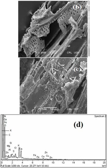 SEM-EDX of sesame biomass in raw, demineralized, and catalyst incorporation was performed. The SEM pictures are presented in Figure 2a–c. Figure 2b contains tiny pores, which have been produced as a result of the treatment with the acid solution due to the removal of the minerals. Figure 2c indicates that the catalyst has effectively been distributed onto the surface of the demineralized sample [40].
