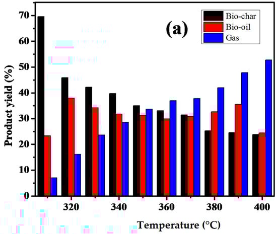 The degradation of the biomass was performed in a salt bath from 300 to 400 °C in nitrogen. The temperature of the pyrolysis chamber was monitored by a temperature controller (Shimaden, E234017, Tokyo, Japan), via thermocouple. Experiments were performed in a glass vessel attached to a condenser and the oil obtained was studied through GCMS (DSQ II, Thermo Scientific, Waltham, MA, USA). The data obtained were matched with an NIST MS library and the peaks were identified accordingly.