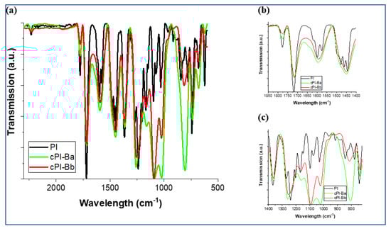 (a) FTIR spectra of PI, cPI-Ba and cPI-Bb. Enlarged FTIR spectra of PI, cPI-Ba and cPI-Bb in the regions (b) 1800–1400 cm−1 and (c) 1400–720 cm−1.