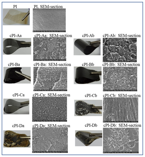 Photographs of PI matrix and all composite films in bended state and their SEM micrographs in cross-sections (2 µm surface, magnification of 10,000×).