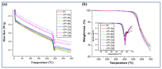 The initial decomposition temperature, taken as 5% weight loss (T5), revealed an improvement for all analyzed samples as compared to the PI matrix (T5 = 526 °C). Higher values for T5 were obtained for the more homogeneous composite films based on acid-functionalized MWCNTs: cPI-Aa, cPI-Ba and cPI-Ca (546 °C, 540 °C and 544 °C, respectively). The degradation mechanism followed the same trend for both PI matrix and the nanocomposite films, employing two decomposition steps. The first step of decomposition was attributed to the less stable ether linkages, while the second step was due to the scission of the main polymer chain. In the case of nanocomposite films, the first step of degradation started at slightly higher values compared to the PI matrix, suggesting that some of the PI ether groups may be involved in interactions with MWCNTs. Instead, the second step occurred at almost the same values for all samples, regardless of the filler type, with a broad TG band profile, without a clear peak in some cases (cPI-Ba and cPI-Ca). As expected, the introduction of MWCNTs in the PI matrix increased the thermal stability and the chair residue of all analyzed samples, which makes the present films suitable for applications that require stability to high temperatures. Figure 4 show the DSC and TG/DTG curves of the PI matrix and the nanocomposite samples.