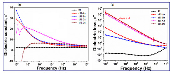The evolution of (a) dielectric constant at room temperature for PI matrix and cPI-Aa, cPI-Ba, cPI-Ca and cPI-Da nanocomposites, and (b) comparative dielectric loss at room temperature for PI matrix and cPI-Aa, cPI-Ba, cPI-Ca and cPI-Da nanocomposites. In (b), the linear decrease tendency of ε″ with frequency was evaluated with a linear fit function.