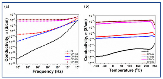 The evolution of conductivity (a) for PI matrix and cPI-Aa, cPI-Ba, cPI-Ca and cPI-Da nanocomposites at room temperature, and (b) as function of temperature at 100 Hz for PI matrix and cPI-Aa, cPI-Ba, cPI-Ca and cPI-Da nanocomposites.