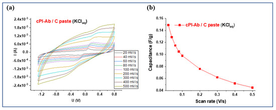However, to improve the electrical charge storage ability of this composite flexible electrode, an increase in the carbon content was considered as in the case of the cPI-Ca sample by painting one of the composite film surfaces with a thin layer of C paste. The rate capability of this electrode (cPI-Ab/C paste) was measured in KClaq electrolyte. As expected, the currents (Figure 9a) were considerably higher, whereas a three-orders-of- magnitude increase in the specific gravimetric capacitance was obtained, with the highest value of 0.149 F/g at 20 mV/s (Figure 9b).