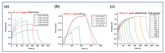 The voltage accumulated in the electrodes beyond which no further charging is possible, known as saturation charge voltage (Vsc) [58,59], was measured. After the saturation potential is achieved, the electrode begins the discharge process. In the case of the cPI-Ca sample, the GCD investigations evidenced very fast charge and discharge processes, a result in line with the low capacity to store charges assessed by CVs. Since cPI-Ca/C paste proved to be very efficient for this purpose, GCD measurements were also recorded on this sample. The Vsc value reached by this electrode was higher in the organic electrolyte (TBAP/ACN, 2.1 V) compared to the 1.4 V obtained in the KCl aqueous electrolyte. Furthermore, Vsc registered higher values at increased current densities. Figure 10 illustrates the GCD curves for cPI-Ca/C paste at different current densities selected according to the rate capability in the tested electrolyte (TBAP/ACN and KClaq). The charge–discharge behavior of this electrode at various time intervals until full charging in the organic electrolyte at a current density of 0.01/cm2 is shown in Figure 10c.