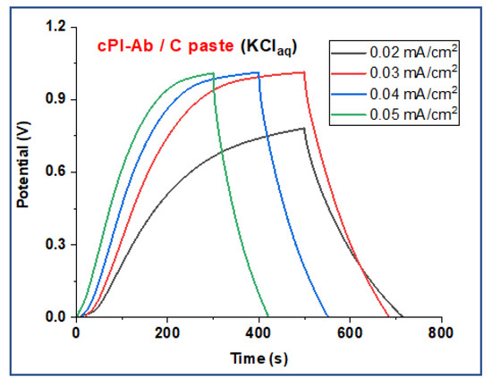 When cPI-Ab electrode was involved in GCD studies, similar results were obtained. Thus, by testing it in the pristine form in the three-electrode cell configuration, a poor operation capability was noticed due to rapid discharge processes, with specific areal capacitance varying from 0.118 to 0.053 µF/cm2 at current densities between 0.016 and 0.05 µA/cm2 in KCl aqueous electrolyte. Considerably higher electrical storage capability was obtained by the cPI-Ab/C paste electrode, demonstrated by the calculated Ca,GCD values which were in the range of 16.03–14.71 mF/cm2 at current densities between 20 and 50 µA/cm2 (Figure 11).