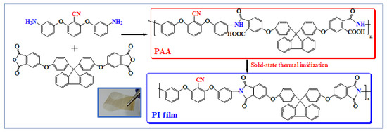 The synthetic route to nitrile-containing polyimide (PI) can be described as follows: in a 100 mL three-necked flask fitted with a nitrogen inlet and outlet, 1.352 g (0.00426 mol) of 2,6-bis(m-aminophenoxy)benzonitrile and 15 mL of DMAc were added. After that, 2.751 g (0.00426 mol) of 9,9-bis[4-(3,4-dicarboxyphenoxy)-phenyl]fluorene and another 15 mL of DMAc were added to the flask so as to obtain a solution with a solid content of 12%. A light-brown clear solution of polyamidic acid (PAA) was obtained in the first step, which was stirred at room temperature for 21 h under a stream of nitrogen. The PAA solution was poured into methanol, filtered and washed several times with methanol to give a solid which was dried at 100 °C for 6 h. To obtain the polyimide matrix, an appropriate quantity of PAA solid was dissolved in DMAc so as to attain a solution concentration of 12%. This solution was filtered and cast onto clean glass substates, being further subjected to a gradual solid-state thermal imidization process at 50, 75, 100, 125, 150, 175, 200 and 250 °C, each temperature for 1 h and at 300 °C for 2 h (Scheme 1). The resulting PI film had a strong adhesion to the glass support and was stripped off the plate by immersion in water. After that, the film having the thickness of about 45 μm was dried in a vacuum oven at 120°C for 6 h and used afterwards for various studies.