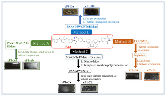 Synthetic approaches to obtain polyimide composites with 2 wt.% MWCNTs and pictures of the corresponding composites.