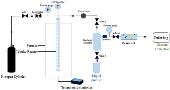 All the SCWG experiments were carried out in a stainless steel (SS316) tubular batch reactor as represented in Figure 1. The reactor is 10 in long with an outer and inner diameter of 0.5 in and 0.37 in, respectively. Tubing and fittings were also made up of SS316 and purchased from Swagelok (Saskatoon, SK, Canada). The tubular reactor is enclosed inside an ATS Series 3210 furnace (Applied Test, Butler, PA, USA) connected to an ATS temperature controller. Other accessories of the reactor assembly include a K-type thermocouple, pressure gauge, pressure relief valve, check valves, 2 μm filters, a gas–liquid separating cylinder and a desiccator.