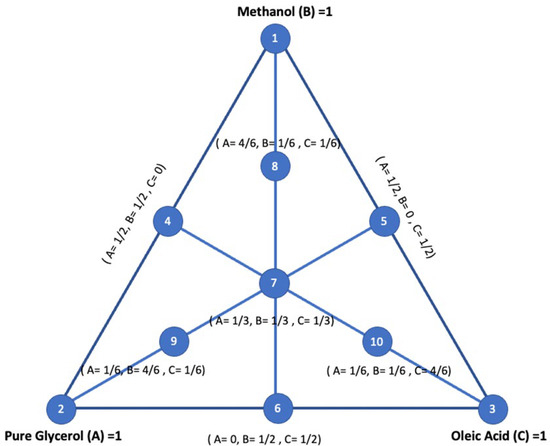 In this study, the constituents of the mixture are pure glycerol, methanol and oleic acid. Weight fractions of these model compounds are the input variables or factors. Pure glycerol, methanol and oleic acid are represented by A, B and C, respectively, with a low and high level of each factor ranging from 0 to 1. The key feature of this design is that for all experiments, the sum of mass or volume fractions of all constituents must equate to unity, as shown in Equations (5) and (6):