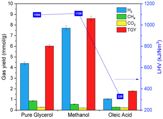 The overall mass balance for the SCWG reactions was in the range of 85–96 wt%. Mass balance could be prone to slight fluctuations due to certain complexities involved in product separation and collection. Several authors have reported mass balance in the ranges of 86–94 wt%, 86–92 wt% and 89–95 wt% from SCWG of lignin [31], bitumen [32] and canola hull pellets [33], respectively. A comparison of individual gas yields, total gas yield (TGY) and LHV of gas products obtained from SCWG of different model compounds of crude glycerol at temperature, pressure, feedstock concentration and reaction time of 500 °C, 23–25 MPa, 10 wt% and 1 h, respectively, is presented in Figure 3. Among different model compounds, methanol resulted in nearly 50% higher TGY as compared to pure glycerol and approximately 5 times more than that of oleic acid. This was due to the simple chemical structure of methanol compared to oleic acid and pure glycerol, which is relatively easy to gasify after bond cleavage. Oleic acid showed the lowest TGY due to its long-chain fatty acids, making it relatively difficult to gasify [34]. The lowest H2 yield from oleic acid was due to the formation of heavy and complex intermediate compounds from its reforming and decomposition, which are difficult to further convert into low molecular gaseous compounds [29]. The gas yields from the SCWG of oleic acid were significantly lower compared to that of pure glycerol and methanol, which also resulted in its relatively lower LHV (87 kJ/Nm3).