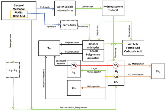 An understanding of these underlying reaction pathways, mechanisms and challenges is important for the industrial scale-up of the SCWG process. Hence, a detailed mechanism for the degradation of crude glycerol constituents during SCWG is proposed in Figure 5 based on the observations of this study and the reported literature [43,44,45]. The constituents of crude glycerol such as glycerol, methanol, oleic acid and FAMEs can undergo a hydrolysis reaction to produce water-soluble intermediates [45]. These intermediate form furfurals and hydroxy acetones [46]. These compounds further convert into ketones, organic acids, aldehydes and phenolics [47], along with gaseous products (e.g., CO2, H2, CH4 and CO) [28]. These intermediate compounds can also undergo polymerization at low temperatures and longer residence time to produce tar, which is an undesired product since it can clog the reactor lines leading to pressure drops and mass transfer limitations [48]. CO further undergoes the WGS reaction to produce more H2 and CO2 or produce CH4 via methanation and hydrogenation reactions [49]. CO2 can also produce CH4 via the methanation route. At high temperatures, model compounds directly decompose into CO2, H2, CH4 and CO.