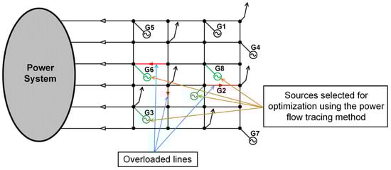 The algorithm used consists of two-stage calculations aimed at identifying generation units for redispatching while also eliminating overloads in grid elements. In the first step, a power flow tracking method is used to select those sources that have a real and significant impact on the overloaded lines. This situation is shown in Figure 1.