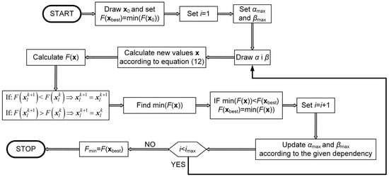 The original, proprietary AIG metaheuristic optimization algorithm (Algorithm of the Innovative Gunner) [23,75] was used for the calculations. A block diagram illustrating the operation of the AIG algorithm is shown in Figure 3 [23].