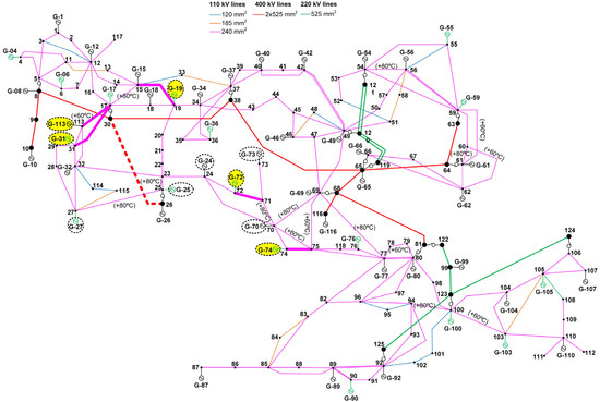 The calculations were performed on the IEEE 118-bus test network [84]. The network has been adapted to the parameters of the network in Poland. The nominal voltage levels of the nodes were changed to 400 kV, 220 kV, and 110 kV; the number of generators was limited; and the data of lines and transformers were adopted as typical in the Polish power system. A diagram of the modified IEEE 118-bus test network is shown in Figure 4. It was assumed that 35 sources are connected to the network, marked in black in Figure 4. The RE sources planned for connection, the number of which is 17, are marked green. Sources connected to nodes 8, 10, 26, 54, 61, 65, 66, 69, 80, 92, 99, and 116 were used for grid power balancing.