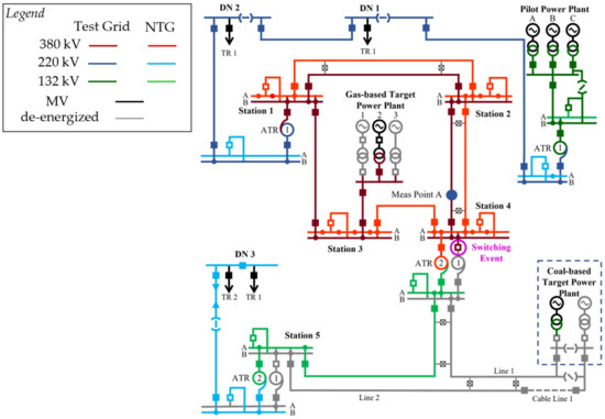The event analyzed in this paper is the electromagnetic transient that follows the energization of the ATR1 of Station 4. Figure 1 represents the network configuration at the time of this event. Up to that moment, the DN1, the DN2, the gas-based power unit, and the HV TN portions of Station 4 were supplied. The closure of the switch on the HV side of the ATR1 supplies the ATR itself, Line 1, Cable Line 1, and Line 2.