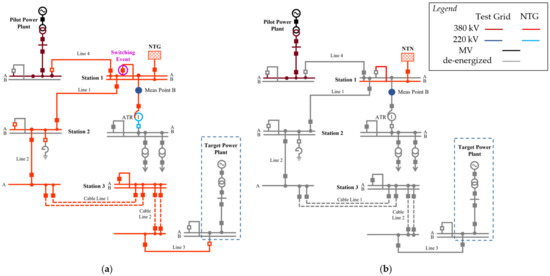 The event of interest, in this case, is the electromagnetic transient that follows the opening of the switch between busbar A and busbar B of Station 1. This event causes the disconnection of the ATR1, Line 1, Line 2, Line 3, Cable Line 1, and Cable Line 2 from the NTG, as shown in Figure 2b. This maneuver is part of the operations needed to build the restoration backbone.