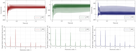 Figure 3 and Figure 4 show the simulation results related to Case A. In particular, Figure 3 shows the instantaneous values of the transient currents that originated from the ATR energizing event, as seen from Point A of Figure 1, for each phase, together with the harmonic content. Analogously, Figure 4 shows the instantaneous transient voltage behaviors for each phase, together with the harmonic content. In Figure 3, a sustained transient overvoltage following the energizing event is clearly visible.