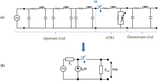 The ATR in Figure 6b and the downstream grid in Figure 6a were replaced by the network impedance Znet and the upstream grid was replaced by the source impedance Zs. In Figure 6b, Ih(t) represents the harmonic content generated during the energization operation; V(t) is the voltage seen from the bus where the equivalent impedance is derived (point M); and Vs(t) is the source voltage.