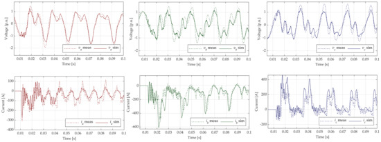 Moreover, the magnitude of the phenomenon was also analyzed by means of a real on-field test in this case. The recordings of the restoration test confirm the evidence obtained from the simulations, as shown in Figure 14. The figure shows the comparison between the simulation results and the on-field recordings of the current and voltage transients, respectively, for the two switching events of Case B. The model is able to qualitatively reproduce the electromagnetic transient of current and voltage behaviors. The high harmonic content of the signals makes their correct qualitative estimation very difficult due to the complexity of the real network with respect to the simulation model. Nevertheless, the presence of a persistent and wide transient of the current and voltage behaviors was also correctly detected in the simulation environment.