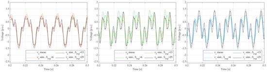 The recordings performed during the test show that the simulated event could happen with a non-negligible magnitude. Figure 7 shows the comparison between the recordings and the simulated currents and voltages for the first 100 ms. The comparisons of Figure 7 show a good agreement between the simulation results and the recorded signals, and the phenomena is qualitatively estimated. The displacement between the real measurements and the simulation results in the peak values of the voltage signals can be attributed to the non-perfect estimation of the transformer saturation curve. In fact, the exact shape of the magnetic core saturation curve is not always available in practice, unless a specific test is performed on the machine. For this reason, in this study, the saturation curve was estimated by means of a polynomial function whose parameters are reported in Table 1. Figure 8 shows the simulated voltage behavior obtained by varying the saturation exponent Sexp. From Figure 8, it is possible to infer that the peak value increases with the value of Sexp for phases b and c, and it decreases for phase a.