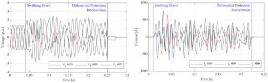 After the switch opening, the de-energized transformer is still connected with the remaining portion of the network, i.e., Lines 1, 2, 3, 4 and Cable Lines 1 and 2. The electric transient that follows the switch opening causes the intervention of the differential protection of the ATR1 which, in real networks, is set to preserve transformers and generators from potential damages. In fact, the high current circulating on the HV side of the transformer is not measured on the LV windings (since the LV side of the autotransformer has already been opened). The unexpected intervention of the differential protection of the ATR1 causes the opening of the switch on both sides of the ATR1, as is possible to observe from Figure 2.
