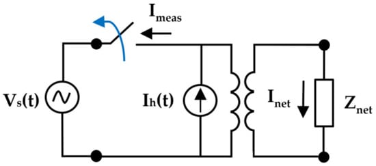 In Figure 13, the network impedance Znet represents the parallel between the ATR and the downstream grid; Ih(t) represents the current harmonic content injected in the equivalent circuit due to the residual magnetization; and Vs(t) is the source voltage. The current harmonics for which the network presents a low impedance are drained by the network itself (Inet), whereas the ones for which the network presents a huge impedance flow through the transformer high-voltage winding (Imeas).