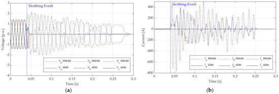 Comparison between the on-field measured phase voltage (a) and current (b) and the simulated ones for Case B. The ATR and the network were separately energized in the simulation.