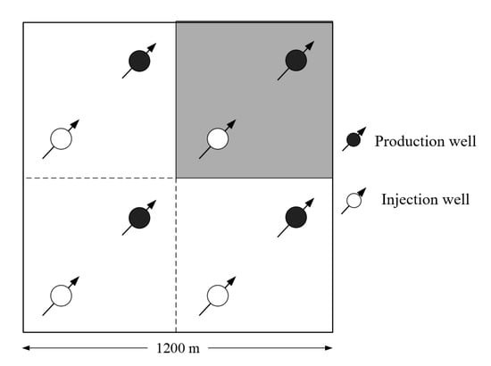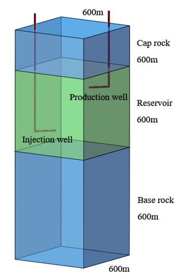 In this study, we will conduct a numerical study on the thermal recovery performance of an idealized EGS model. The configuration of the injection and production wells utilized in the model is depicted in Figure 1. Due to the periodicity of the well distribution, a region with the length and width of 600 m, respectively, is selected, as shown in Figure 2. The region described by the physical model (see Figure 2) is 3500–5200 m underground, and the depth of the top and bottom surfaces of this physical model is 3500 m and 5200 m, respectively. The height of the fractured reservoir is 600 m, shown as the green region in Figure 2. Furthermore, considering that the surrounding strata may affect the numerical results, a cap region and a base rock with a height of 300 m and 800 m, respectively, are adopted. The depth of the injection well and production well are 4000 m and 4500 m, respectively.