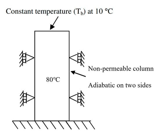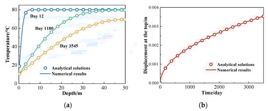To examine the accuracy of the simulation program, the heat conduction process in an impermeable rock column subjected to uniaxial strain in the vertical direction, as shown in Figure 3, is conducted. Initially, the temperature is 80 °C, then a lower temperature of 10 °C is applied on the top surface. When heat conduction occurs, there will be a displacement on the top surface of the column. Detailed parameters required for this case, including initial conditions and physical properties, are listed in Table 1. The analytical solutions of temperature distributions and displacement can be obtained using the finite Fourier transform [32]. Figure 4a,b shows the evolution of temperature with depth and the top surface deformation at different times, respectively. It indicates that the present numerical results are consistent with the analytical ones, which verifies the accuracy of the program and the numerical implementation.