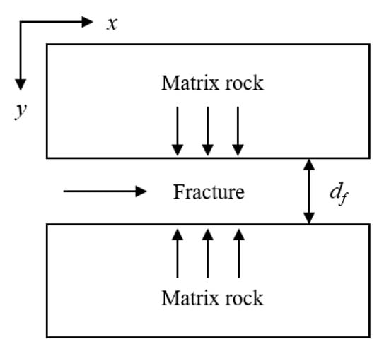 The second test case is the heat transfer process in a single straight fracture (see Figure 5), in which the width of the fracture is 0.03 m, and the length of the matrix is 10 m. In addition, the rock matrixes are assumed to be homogeneous and isotropic and maintained at 80 °C. The water with a temperature of 30 °C and a flow rate 0.001 kg/s will transport across the fracture and absorb heat from the rock matrixes. Table 2 denotes the parameters used in this case.