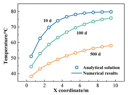 Figure 6 compares the calculated temperature fields in the fracture with the analytical solutions [34]. The excellent consistency between present numerical results and analytical solutions in Figure 6 again proves the reliability of the program.
