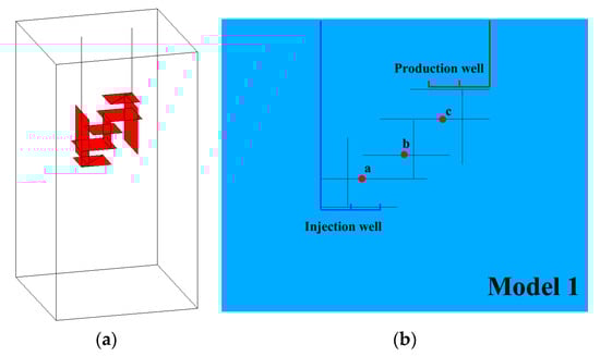 In order to investigate the thermal–hydraulic–mechanical characteristics of EGS using the THM coupling model, a physical model embedded with fracture networks is established, as shown in Figure 7. In this model, the total volume of fractures is 6656.25 m3, in which the vertical fractures and the horizontal fractures account for 55% and 45%, respectively. To explore the parameter variations at different locations in the reservoir, three locations a, b and c are taken as reference points, and the positions are shown in Figure 7b. The porosity and permeability of these cracks are 0.3 and 3.2 × 10−9 m2, respectively. The width of fractures is 3 cm, and the other parameters of fractures are listed in Table 3. It should be noted that it is challenging to obtain the physical properties of the reservoir for actual geothermal fields. Therefore, the values of these parameters are chosen according to their ranges published in the available literature [24,35,36,37].