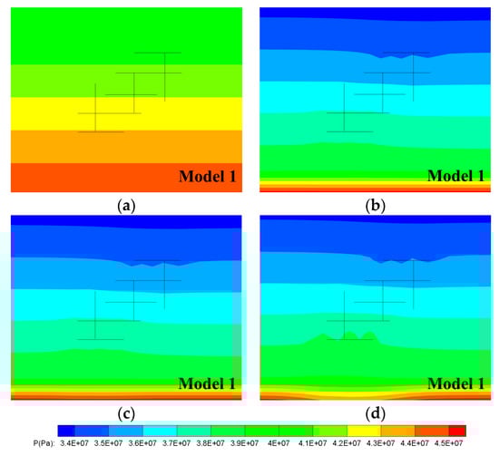 Pressure field distributions of the EGS at different times: (a) 0 years, (b) 5 years, (c) 10 years, and (d) 30 years.