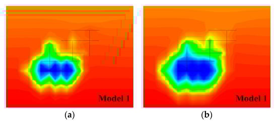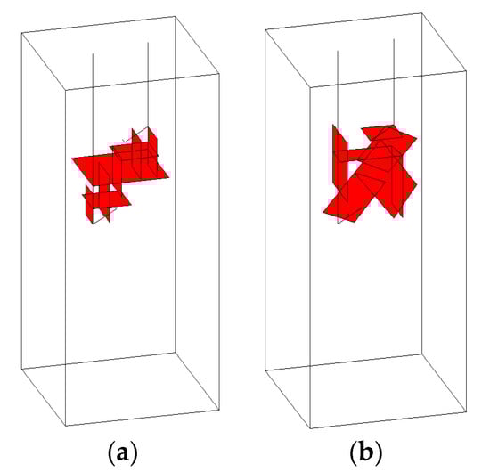 In order to investigate the impact of the fracture morphology, two different fracture networks are also established, as illustrated in Figure 15. The initial boundary condition of Model 2 and Model 3 is the same as Model 1 (See Figure 7a), and only the direction of the fractures is different. The comparison between the parameters of fractures in various models is listed in Table 4. These three models have almost the same volume of total fractures, while the fracture morphology is different. In physical Model 1 (see Figure 7), there are no inclined fractures, and the horizontal fractures dominate in volume, accounting for 55%. In physical Model 2 (see Figure 15a), the horizontal fractures and vertical fractures account for 45% and 55%, respectively. In physical Model 3 (see Figure 15b), the vertical fractures, horizontal fractures, and inclined fractures each account for 1/3.