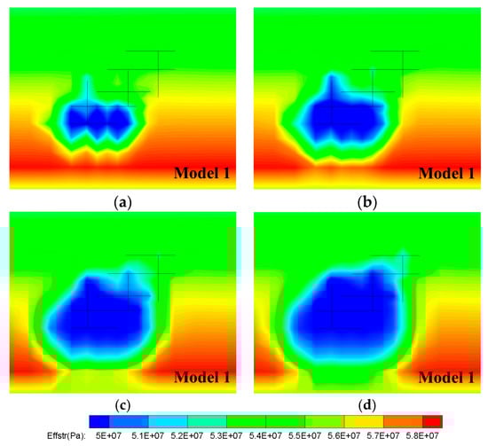 Evolution of effective stress field: (a) 5 years, (b) 10 years, (c) 20 years, and (d) 30 years.