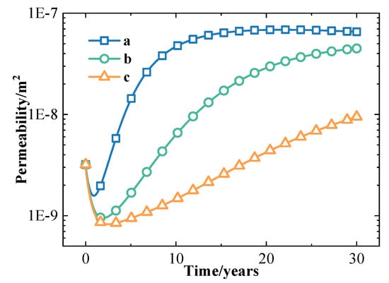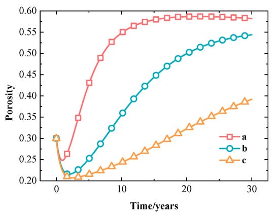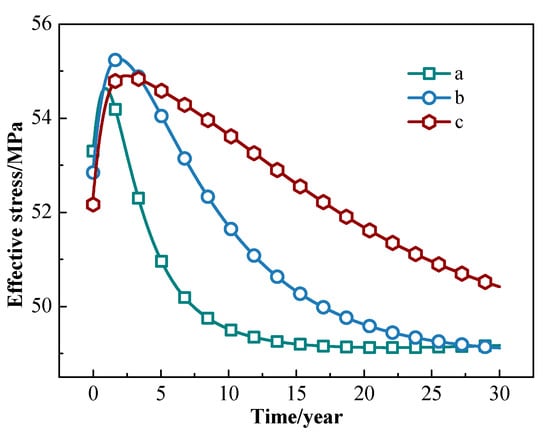 Figure 13 and Figure 14 depict the changes in porosity and permeability, respectively, at specific locations (#a to #c) over time due to mining activities. The results of Figure 13 indicate that the porosity displays almost a contrary tendency with effective stress (see Figure 11), i.e., as time increases, the local porosities firstly decrease and then increase. Within the first two years of mining, the porosities of the three points (#a to #c) decrease from 0.3 to 0.248, 0.216, and 0.207, respectively, and then finally increase to 0.586, 0.543, and 0.391, respectively. In addition, it can be found that the porosity near the water injection well is larger. This is because the lower temperature around the injection well leads to lower effective stress. The evolution of local permeability shows similar trends of local porosity, i.e., as time increases, the local permeability firstly decreases and then increases.
