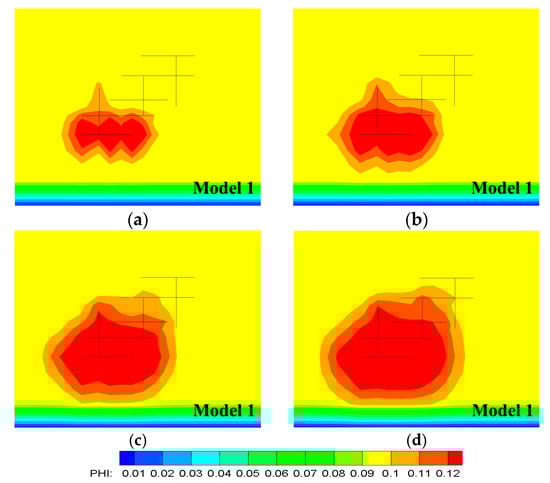 The change in the effective stress results in the change in reservoir porosity and permeability parameters. Figure 12 shows the evolutionary process of porosity at different times. It can be seen from Figure 10 and Figure 12 that the decrease in effective stress results in an increase in porosity.