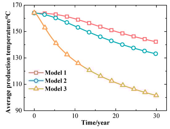 Figure 16 plots the average production temperature of the above models as a function of time. It can be seen that, as exploitation time increases, the average production temperature of Model 3 drops rapidly. At the 30th year after the operation of the EGS, the average production temperature in Model 3 decreases from 164 °C to 101.5 °C, and the average production temperature reduction is up to 38.1%. Correspondingly, the final average production temperatures in Model 2 and Model 1 are 133°C and 142 °C, respectively. Thus, at the 30th year after the operation of the EGS, Model 1 exhibits the best performance with the highest production temperatures. Moreover, it is observed that, unlike in Model 3, the production temperatures in Model 1 only change slightly within 10 years, indicating that Model 1 is relatively stable in a short time. This is because the vertical fractures and inclined fractures in Model 2 and Model 3 make it easier for cold fluid to flow directly between the injection and the production wells without performing sufficient heat exchange with the rock matrix. In contrast, the dominant horizontal fractures in Model 1 lead the cold fluid to move horizontally, thereby increasing the path for the heat exchange between flow and rocks, and consequently leading to a gradual rise in production temperatures.