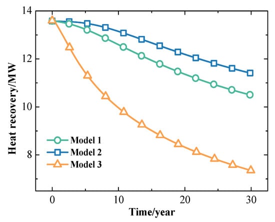 Figure 17 shows the heat recovery of different models as a function of the exploitation time. It can be seen that, with the increase in the running time, the heat recovery of these three models decreases monotonously. At 30 years after the EGS has begun running, the reductions in heat recovery are 17.3%, 23.3%, and 46.6% for the different models, respectively.