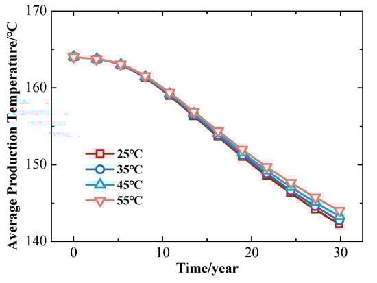 Given that Model 1 demonstrated superior performance in Section 3.2.1, in the following section, we will mainly focus on the performance of Model 1. The injection temperatures of 25 °C, 35 °C, 45 °C, and 55 °C are selected to study the influence of the injection temperature and the thermal recovery potential of the EGS. The average production temperatures are plotted as a function of time in Figure 18. Notably, the production temperatures remain almost constant within the first 10 years of operation, regardless of the injection temperature. Subsequently, with the increase in injection temperature, the production temperature increases slightly. At 30 years after the operation, when the temperature of the injected fluid increases from 25 °C to 55 °C, the production temperature increases from 142.2 °C to 144.0 °C, with an increment of 1.2% only. This means the injection temperature barely influences the production temperature.