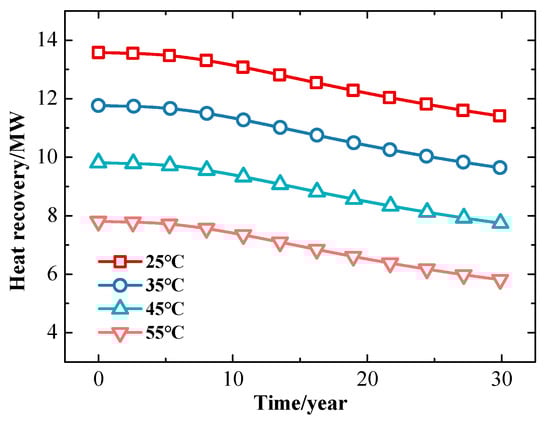 The heat recovery with different injection temperatures is shown in Figure 19. It is observed that, with the increase in the injection temperature, the heat recovery decreases. This outcome is attributed to the fact that decreasing the injection temperature enhances the temperature disparity between injection and extraction fluids, thereby increasing heat recovery. In the first 5 years, the heat recovery at different injection fluid temperatures is relatively stable, and the heat recovery with injection temperatures of 25 °C, 35 °C, 45 °C, and 55 °C is 13.5 MW, 11.7 MW, 9.7 MW, and 7.7 MW, respectively. Then, as time goes by, the heat recovery begins to decrease gradually. From 5 to 30 years, the heat recovery at the injection temperature of 25 °C gradually decreases from 13.5 MW to 11.4 MW. Thirty years after the operation, as the injection temperature increases from 25 °C to 55 °C, the heat recovery decreases from 11.4 MW to 5.8 MW, with a decrease of up to 49%. That means that reducing the injection temperature is an effective way to increase the heat recovery capacity.