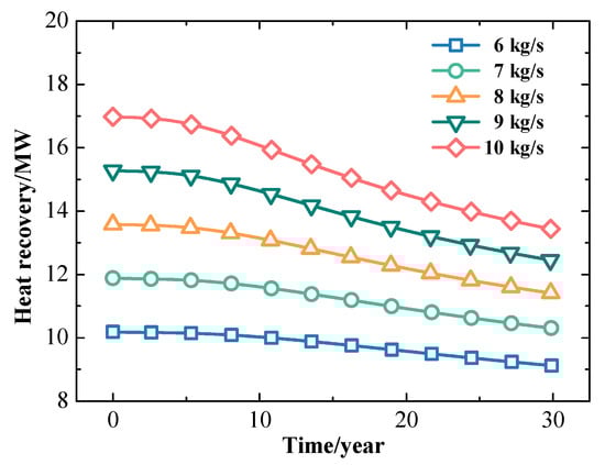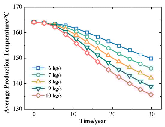 To investigate the influence of injection flow rates on the heat recovery capacity, five different injection flow rates, i.e., 6.0, 7.0, 8.0, 9.0, and 10.0 kg/s, are selected. Figure 20 shows that the average production temperatures vary with time at different injection flow rates. It can be found from Figure 20 that the production temperatures with different injection rates in the first 3 years are almost 164 °C, which is relatively stable. Then, the value of the production temperature with different injection flow rates begins to decrease with the increase in operation time, and the production temperature decreases monotonically as the flow rate increases. At 30 years after the operation, the production temperatures with the flow rates of 6.0, 7.0, 8.0, 9.0, and 10.0 kg/s decrease from 164 °C to 149.8 °C, 145.8 °C, 142.2 °C, 138.7 °C and 135.5 °C, respectively.
