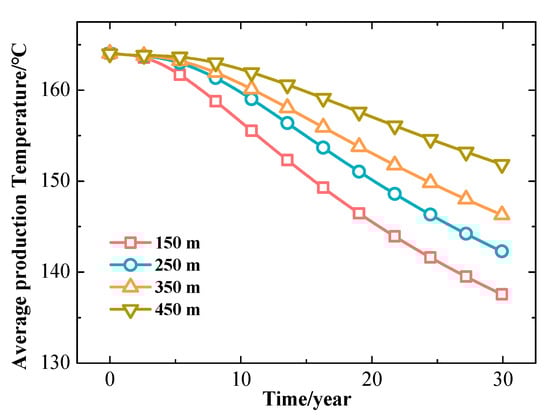 In order to analyze the influence of the injection–production well spacing on heat extraction performance, four different cases with injection–production well spacing of 150 m, 250 m, 350 m, and 450 m are selected for simulations. Figure 22 plots the average production temperatures as a function of time for different well spacing. It can be seen from Figure 22 that, as the distance between the injection well and the production well increases, the production temperature increases, while the growth rate becomes gradually inconspicuous. When the distance between injection and production wells is 150 m, the production temperature begins to decrease after the system has been running for about 2 years, and the production temperature drops from 164 °C to 137.5 °C after 30 years. Correspondingly, the production temperature drops for the well spacing of 250 m, 350 m, and 450 m are 21.8 °C, 17.8 °C, and 12.2 °C, respectively, in 30 years. This can be attributed to the fact that, with the increase in the injection–production well spacing, the path that the working fluid travels becomes longer, and the working fluid can be continuously heated.