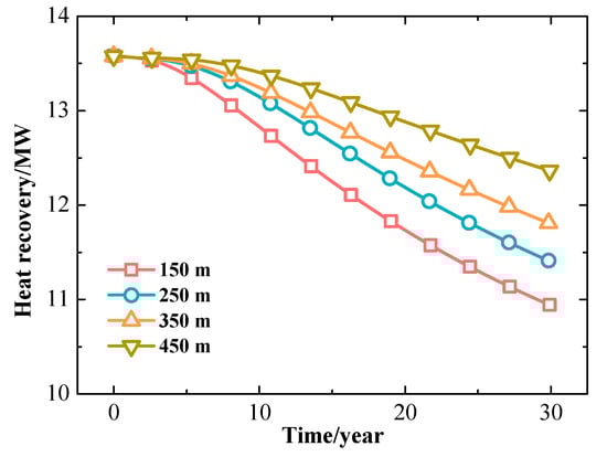 The heat recovery of EGS with different injection–production well intervals that varies with time is similar to the production temperature, as shown in Figure 23. It can be seen that, at the 30th year after mining, increasing the injection–production well spacing from 150 m to 450 m results in a heat production increase from 10.9 MW to 12.4 MW, representing a significant increase of 13.7%. Therefore, it is necessary to choose the well spacing appropriately for economic benefits and mining stability.