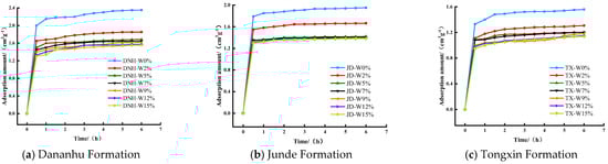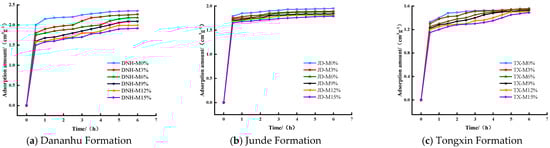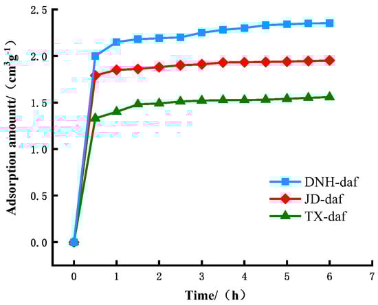Figure 5 shows the CO2 adsorption curves of dry coal samples with different mineral contents. Similar to the demineralized dry coal samples, the variation in the CO2 adsorption amount for each coal sample over time was consistent. With an increase in the mineral content, the CO2 adsorption capacity of coal showed a decreasing trend because the minerals occupied the pore space in the coal, leading to a reduction in the number of coal adsorption sites and thus reducing the CO2 adsorption capacity of coal. The CO2 adsorption capacity of the three coal samples decreased with increasing mineral content to varying degrees, among which the saturated adsorption capacity of DNH coal decreased the most and that of TX coal decreased the least with increasing mineral content. This may have occurred because among the three coal samples with the same mineral contents, DNH coal had the largest number of micropores, which led to more minerals filling the micropores of coal in the form of bands and lumps [27]. Accordingly, we determined that the mineral content more strongly impacted the CO2 adsorption capacity of DNH coal.