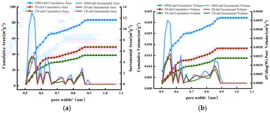 Figure 3 shows the specific surface area, pore volume, and curve of the coal samples in the microporous range. In the figure, the cumulative specific surface area and pore volume curves of the three coal samples exhibit the same trend. The cumulative specific surface area and pore volume gradually increased with increasing pore size, indicating the presence of micropores <1 nm in the coal. The cumulative specific surface area and pore volume of DNH coal were the largest, followed by those of JD and TX coals, which was consistent with the order of the saturated CO2 adsorption amount of the three coal samples.