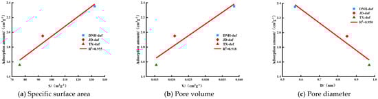 To explore the influence of pore structure on the CO2-saturated adsorption capacity, we plotted the relationship between the total specific surface area, total pore volume, and mean pore diameter of the coal samples measured in the experiment with CO2-saturated adsorption, as shown in Figure 4. The specific surface area and pore volume of DNH coal sample are significantly higher than those of the other two coal samples, while the average pore size of TX coal sample is the largest, indicating that the micropores of DNH coal samples are more developed. The determination coefficient (R2) of total specific surface area and CO2-saturated adsorption capacity was the highest, at 0.955, indicating that the specific surface area was the main factor affecting CO2-saturated adsorption capacity. Both the specific surface area and pore volume were positively correlated with the saturated adsorption capacity of CO2 due to the larger total specific surface area and total pore volume of coal, which provided more adsorption sites and thus facilitated the adsorption of CO2 by coal [25]. However, the mean pore diameter negatively correlated with the CO2-saturated adsorption capacity. This may be because intermolecular forces were the main factor affecting the CO2 adsorption effect. The smaller the pore diameter of each micropore, the higher the adsorption potential energy between the pore walls (due to the overlap of van der Waals force fields), and the higher the CO2 adsorption capacity [26]. Additionally, the smaller the average pore diameter and the larger the number of micropores, the larger was the total specific surface area. As the specific surface area more strongly affected the CO2-saturated adsorption capacity, the saturated adsorption capacity of CO2 by coal decreased with increasing pore diameter.